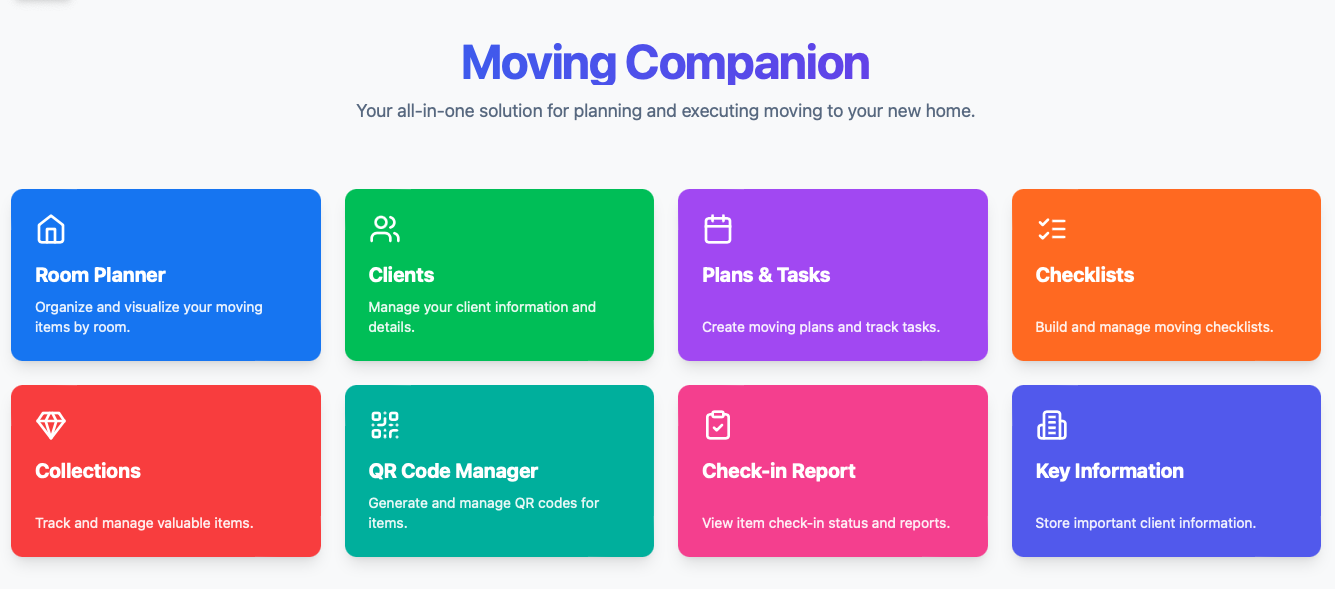 How each room will be set up with furniture, artwork, appliances, other household items. The Moving Companion provides the destination of each item on a manifest and QR Coded labels used by the movers.